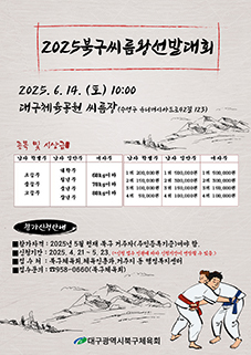 한편 이번 대회는 남자학생부(초·중·고), 남자일반부(대학·청년·장년·중년), 여자일반부(60kg·70kg·80kg이하) 총 3개부 10종목별 토너먼트 경기 방식으로 진행된다. 입상자에게는 상장 및 시상금이 수여되며, 특히 1 ~ 3위 입상자에게는 북구를 대표하여 대구시 씨름왕 선발대회에 참가할 수 있는 출전권이 함께 부여된다. 대회 관련 기타 자세한 사항은 북구체육회(☎053-958-0660)로 문의하면 된다.