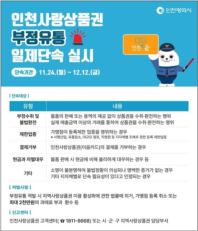 인천광역시(시장 유정복)는 11월 24일부터 12월 12일까지 인천사랑상품권의 부정 유통을 방지하고 건전한 유통 질서를 확립하기 위해 일제 단속을 실시한다고 밝혔다.