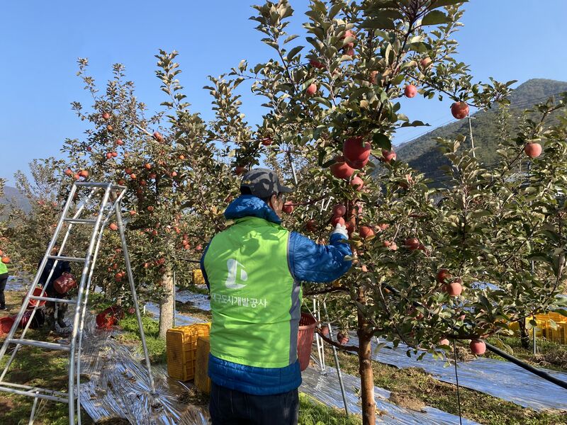 대구도시개발공사(사장 직무대행 정명섭)는 지난 14일 안동시 길안면에서 수확철 농가의 인력 부족 해소와 지역 상생을 위해 사과 농가 일손돕기 봉사활동을 진행했다고 밝혔다.