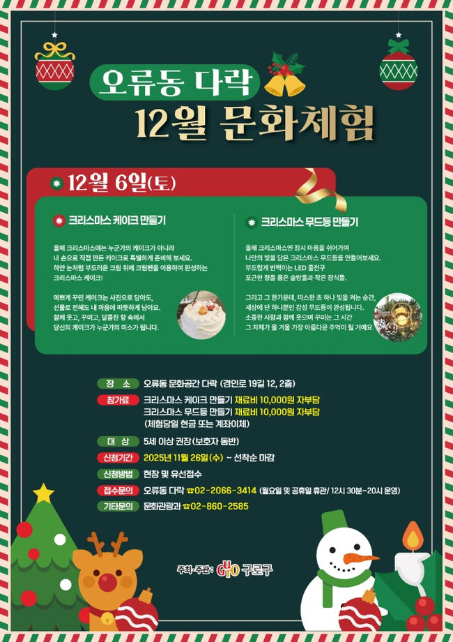 구로구, 다락에서 12월 겨울 특화 프로그램 운영… “연말 따뜻한 문화시간 선물” - 신도림·오류동 다락에서 겨울 감성 영화 6편 상영 - 케이크·무드등 만들기 등 크리스마스 체험 마련 - 5세 이상 누구나 참여… 방문·전화 신청 후 선착순 마감