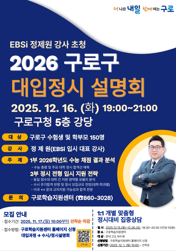 구는 오는 12월 16일 저녁 7시 구청 강당에서 ‘2026 구로구 대입 정시 설명회’를 연다.