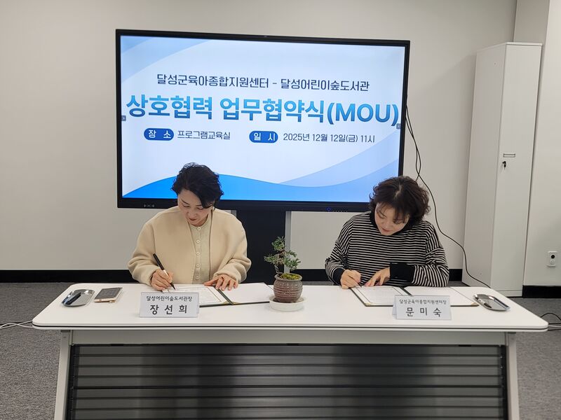 장선희 달성어린이숲도서관장은 “같은 건물에 위치한 두 기관이 긴밀히 협력함으로써 아이들이 책과 놀이, 돌봄이 자연스럽게 이어지는 환경 속에서 성장할 수 있도록 최선을 다하겠다”고 말했다.