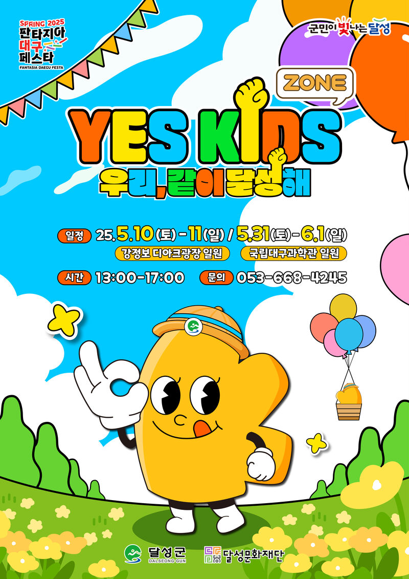 (재)달성문화재단(이사장 최재훈)은 가정의 달을 맞아, 어린이날 축제인 ‘2025 YES! 키즈존’을 오는 5월 10일부터 11일, 5월 31일부터 6월 1일까지 두 차례에 걸쳐 개최한다고 밝혔다.