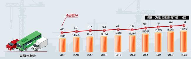 조사에 따르면, 올해 하루 평균 차량 통행량은 16,262대로 지난해보다 1.3% 늘었으며, 지난 10년간 평균 1.6% 증가하는 추세를 보이고 있다. 이는 자동차 등록 대수 증가와도 맞물려 있다.